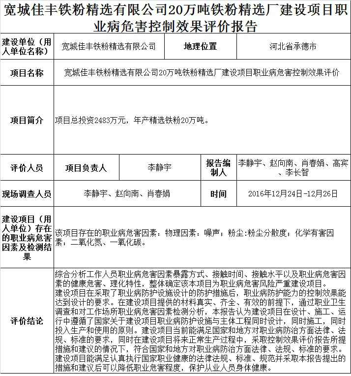 宽城佳丰铁粉精选有限公司20万吨铁粉精选厂建设项目职业病危害控制效果评价