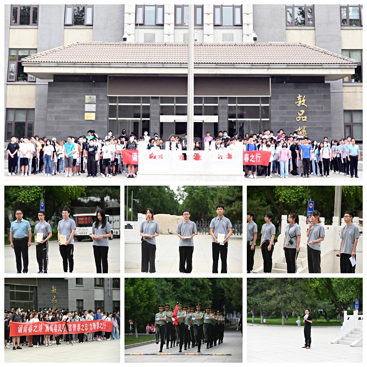 上午7时,国旗班的同学迈着铿锵有力的步伐,主题升旗仪式正式开始,升国旗、唱国歌、敬礼,鲜艳的五星红旗在师生的注目中冉冉升起。升旗结束后,2019级各班9位员工代表集体在国旗下朗诵中国共产党的主要创始人之一李大钊同志《青春》节选文章,“以青春之我,创建青春之家庭,青春之国家、青春之民族”的铿锵誓言在敦品楼前久久回响。同学们通过声情并茂的朗诵,进一步深刻感受到李大钊同志坚定的爱国主义精神以及他在青年时代面对多灾多难的祖国表现出忧国忧民的赤子之心。