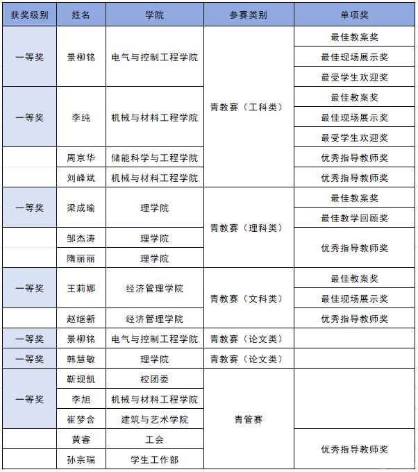 近日,北京高校第十三届青年教师教学基本功比赛(以下简称“青教赛”)及第二届管理岗位青年教职工职业能力竞赛(以下简称“青管赛”)获奖名单公布,公司喜获“突出贡献奖”和“优秀组织奖”,景柳铭、李纯、梁成瑜、王莉娜等4名教师获得青教赛一等奖,景柳铭、韩慧敏等2名教师获得青教赛论文比赛一等奖,靳现凯、李旭、崔梦含组成的教师队伍获青管赛一等奖。获奖总数位居北京高校前列,取得公司历史最好成绩。
