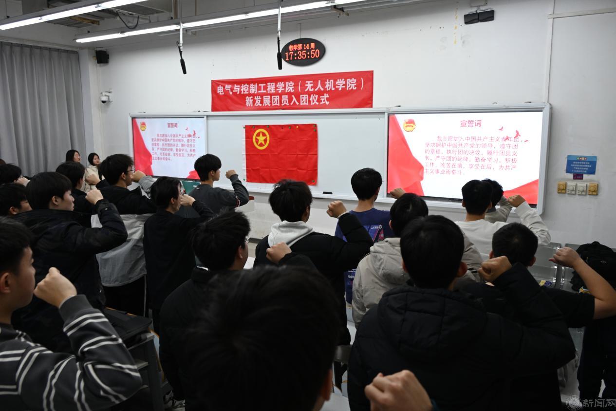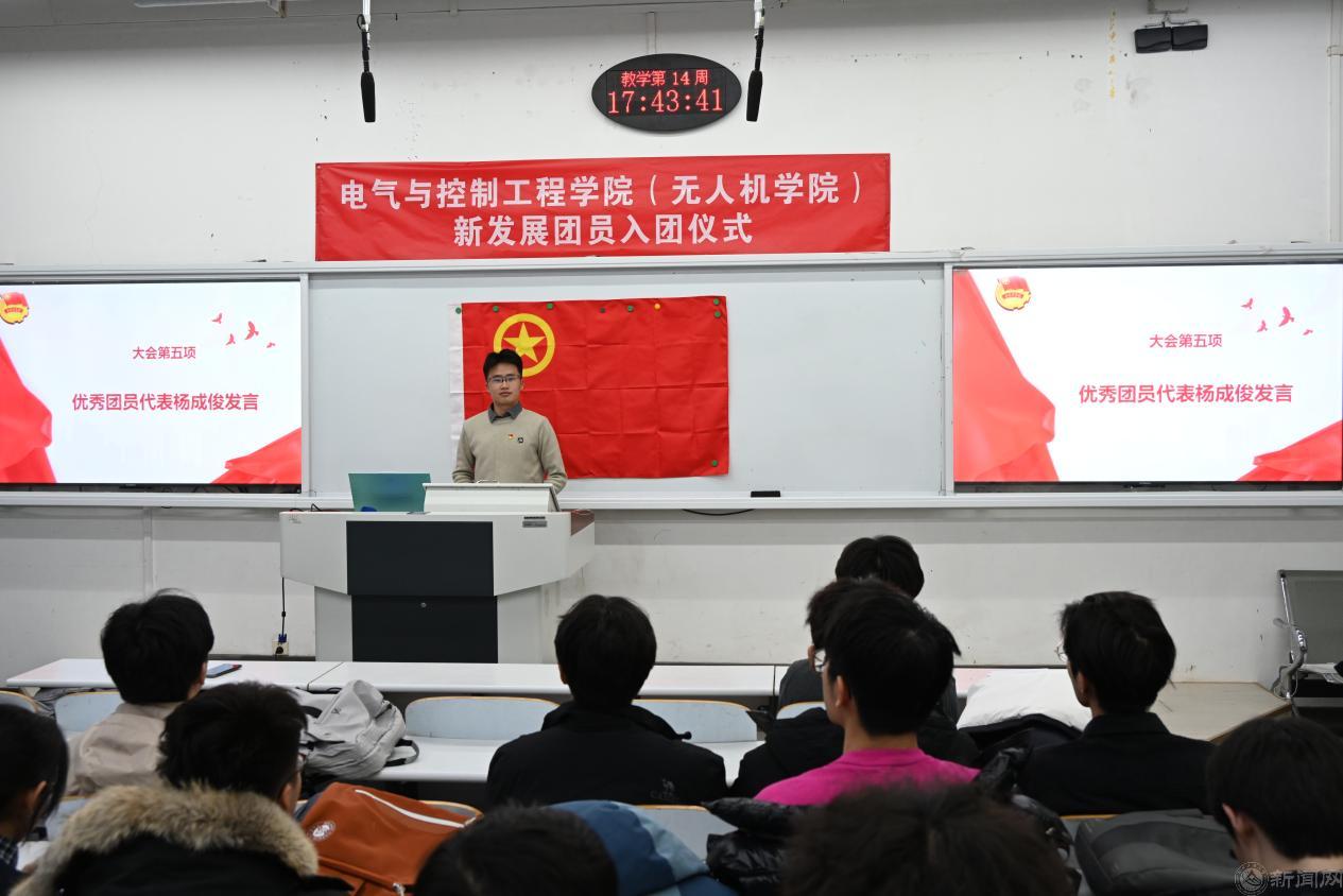 优秀团员代表杨成俊杨成俊结合自身经历,分享了成长路上的感悟与收获。他回忆了初入校园时的迷茫与困惑,以及在老师指导和自身努力下,斩获国家奖学金、国家励志奖学金等多项荣誉,并成功推免至中南大学攻读硕士学位的奋斗历程。同时,他讲述了自己担任学院团委副书记、班级班长等多项员工职务,服务千余名同学的责任担当;分享了作为骨干志愿者参与纪念中国人民抗日战争暨世界反法西斯战争胜利 80 周年活动、烈士纪念日敬献花篮仪式等重大活动的难忘经历,以及作为北京市员工资助宣传大使、“青马工程”学员宣讲党的政策、传递青春正能量的使命践行,激励新发展团员以昂扬姿态扛起青年一代的时代责任。随后杨成俊带领全体新团员面向团旗庄严宣誓,誓言铿锵有力,表达了新团员们对共青团的忠诚与信念。