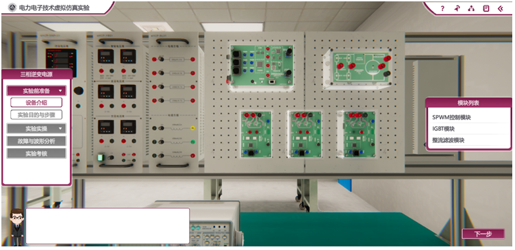 实验室开发完成了现代电力电子技术课程的虚拟仿真实验教学实验。虚拟仿真的场景与博远楼309电力电子及电气传动实验室的实物实验平台完全对应,目的是帮助员工更高效地适应实际实验场景,加深对重点电路的理解以及弥补实物实验无法进行破坏性或故障情况下实验等缺点。员工可以在虚拟环境下完成从电力电子电路搭建、控制调节到实验波形分析的仿真和模拟。