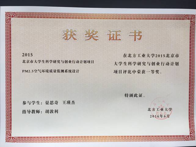 测试仪设计硬件采用MSP430系列的msp430f149为微处理器,包括PM2.5检测电路、温度检测电路、湿度检测电路、LCD显示等,测试仪自带电池,可以实现温度、湿度和PM2.5数据的实时采集显示,测试仪体积小,测量精度准确。该项目获2015北京市老员工科学研究与创业行动计划项目一等奖。2015年该项目在核心期刊 高技术通上发表论文一篇。