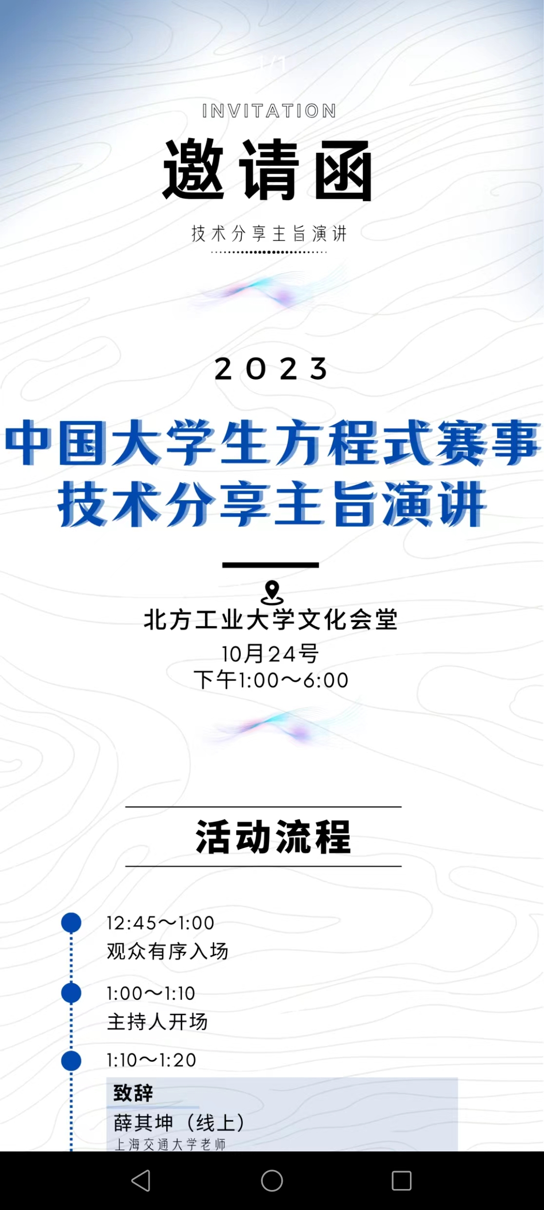中国老员工方程式赛事技术主旨演讲,是我车队主办的老员工方程式技术交流会,邀请了上海交通大学、河北工业大学、浙江水利水电学院、北京航空航天大学、福建农林大学、湖北汽车工业学院、武汉理工大学车队成员或老师会上发言分享,并有清华大学、北京理工大学、北京信息科技大学、江苏大学等车队成员参加。