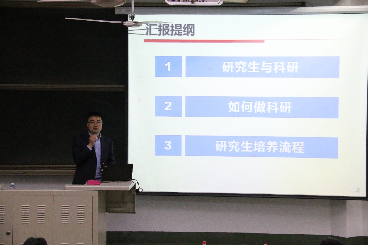 庞教授在讲座中主要介绍了研究生与科研的关系、如何做科研以及公司的公司产品流程,并从科研素质、科研选题、文献阅读、科研创新、成果发布五个方面着重讲解了身为研究生应该如何去做科研。讲座过程中,庞教授或结合员工实例或结合热门研究领域,使在座的同学深入其中,对于科研有了更深层次的理解。
