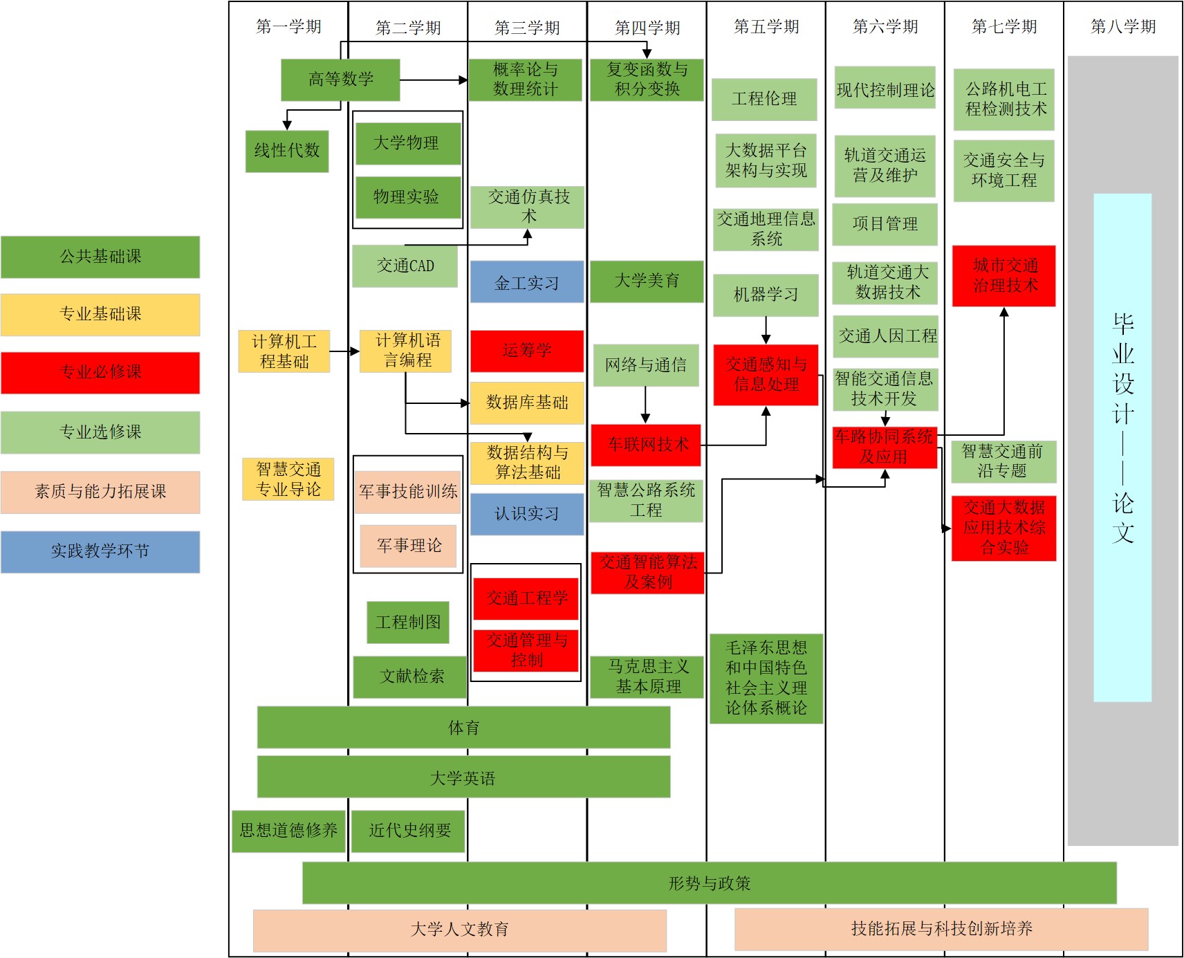 高等数学、大学物理、计算机语言编程、运筹学、交通智能算法及案例、车联网技术、交通工程学、交通管理与控制、交通感知与信息处理、车路协同系统及应用。